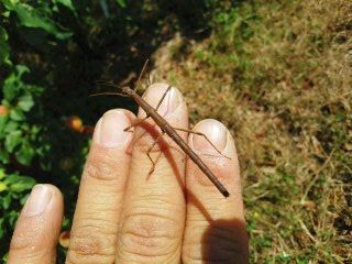 南高梅の収穫中、ナナフシが出てきました。枝に擬態していたのでしょうが、気づかずに収穫しておりましたら、動き出しました。