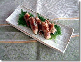 - ニンジン、ナス、インゲンを豚肉で巻き、焼く